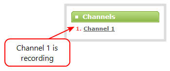 In the Admin panel, the channel number turns red to indicate it's recording. If the system runs out of storage space, the oldest recorded file is deleted to make room for the new recording.