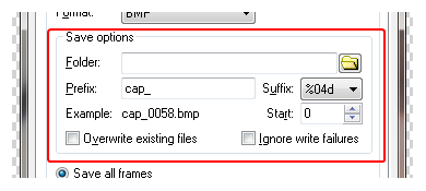 - Use the Suffix drop down to determine whether you're using decimal (d) or hexidecimal (X) characters for the suffix, and the number of leading zeros in the filename (e.g. %04d means a decimal suffix with 4 digits, the first few will have three leading zeros (cap_0001.bmp)).
