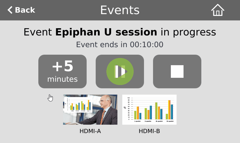 We’re making it simple for you to extend your active CMS events in five, ten, or fifteen minute intervals right from the touch screen. And for Panopto events, press pause when you need a break but don’t want the event to stop. You can also mute the audio while paused and display an “event paused” image.