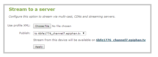 1. Click Apply; a connection through the media tunnel is established. The system streams to Epiphan’s portal – epiphan.net.