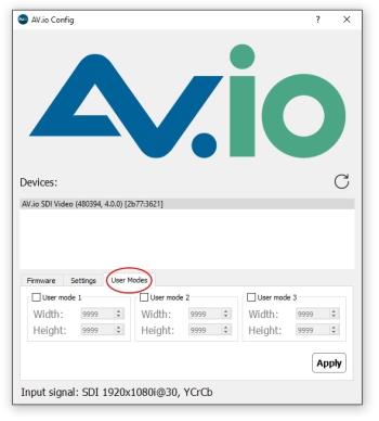 - In a Windows environment, due to restrictions set by Microsoft’s Windows Hardware Quality Labs certification, most graphics adapters or drivers will not output resolutions not included in the EDID file of the connected display device. In the scenario where a resolution that is not included in the AV.io SDI standard resolution is requested, the Graphics adapter and driver will apply the resolution requested and then upscale it to AV.io SDI’s default resolution. This means the User modes feature will not add the custom resolutions to the UVC descriptor and the capture software will be limited to the pre-defined resolutions.