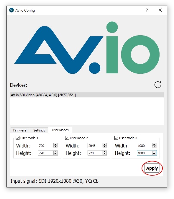 - Select your AV.io SDI device from the list under the Devices heading.