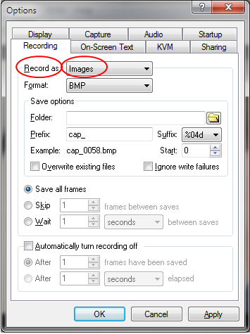 - To use the record button/control to stop saving images, leave Automatically turn recording off unchecked; otherwise, check the checkbox and specify your limit in frames or seconds.