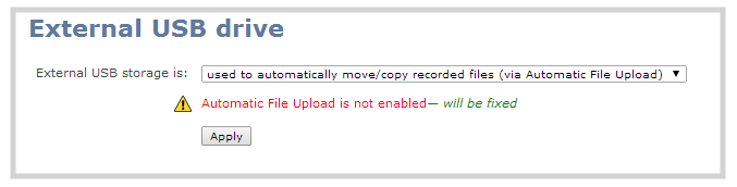 Using the fix link disables any other type of automatic file upload you have configured. When you are done with USB uploads, return to the Automatic File Upload configuration page and re-configure FTP, RSYNC, or CIFS.