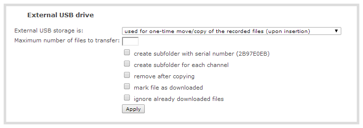 create subfolder with serial number (<serial>)If checked, the transfer process creates a sub-folder with the system’s serial number on the USB drive. This is useful if you are using the same drive to collect recordings from multiple systems and want to know which system they came from.