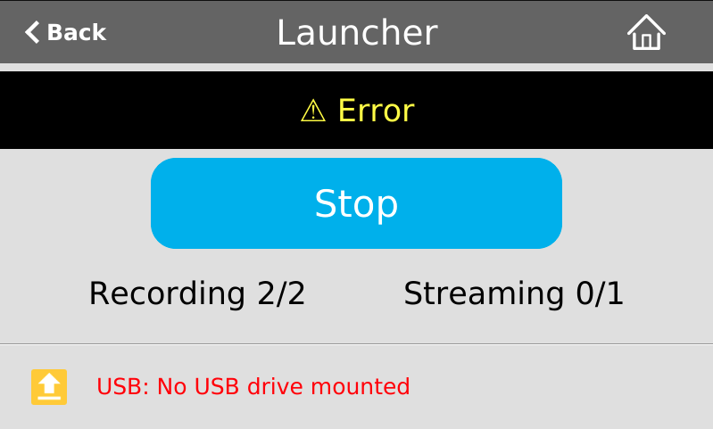 In this example, after pressing Start, both recorders/channels are recording properly but the one channel configured for streaming is not streaming correctly. One or both channels was configured to automatically transfer recorded files to an external USB drive. But Pearl systemwas not able to mount the USB drive or no USB was inserted.
