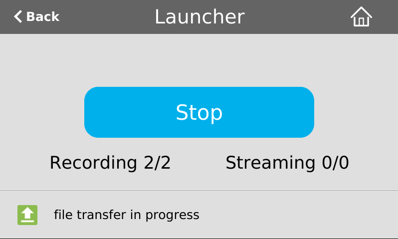 In the example above, Single Touch control has been activated and both channels out of the two total channels and/or recorders are recording successfully. There is no streaming activity because there are no channels configured for Single Touch streaming. Also in this examplePearl systemis configured to automatically upload files to an external destination such to a an attached USB driver or a network location. This screen shows that Pearl systemis uploading the file(s) to the destination.