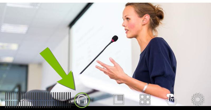 Tap the headphones icon on the touch screen to adjust the volume. Each tap increases the volume by 25% to a maximum volume of 100%. Tapping the headphones icon when the volume is at 100% mutes the volume. You can also long press the headphones icon to mute and unmute the volume.