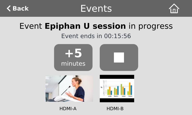 If there's more than five minutes before the next scheduled event, a Create event button for ad hoc events appears beside the Start event button. For more about the different Events screens, see CMS event controls using the touch screen.