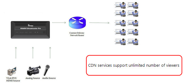Stream web content to many viewers on different Content Delivery Networks simultaneously to any geographical location. Using a CDN to host your broadcast is highly scalable and saves you from having to purchase and maintain your own servers to host and deliver video content. Using one or more CDNs to stream live content allows you to reach a large geographically diverse audience and because CDNs perform format conversion, the stream is platform independent. Streaming protocols supported include: SRT (push), HLS (push), RTMP/RTMPS, For more information about streaming to a CDN, see Streaming to servers, CDNs, and other devices. |