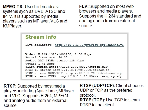 The live broadcast stream URLs for a channel are available from the Channel menu in the Admin panel when you select Status. The audio and video codecs configured for the channel affect which live broadcast formats are listed.