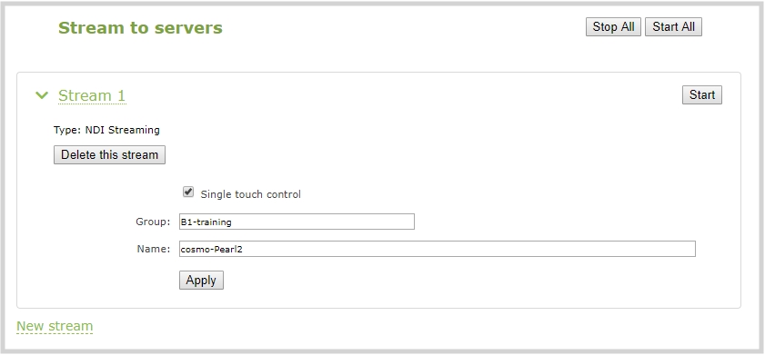 - Click New stream and choose NDI Streaming. The new stream is created using the default name Stream 1.