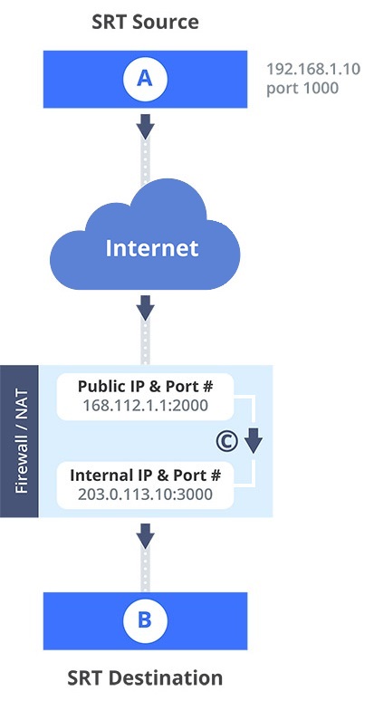 The public IP address of the Firewall/NAT is 168.112.1.1 and port 2000 is the designated SRT streaming port. All traffic received at 168.112.1.1 on port 2000 is granted permission to pass through the firewall and is forwarded ( C ) to Destination B's internal IP address (203.0.113.10) on port 3000.