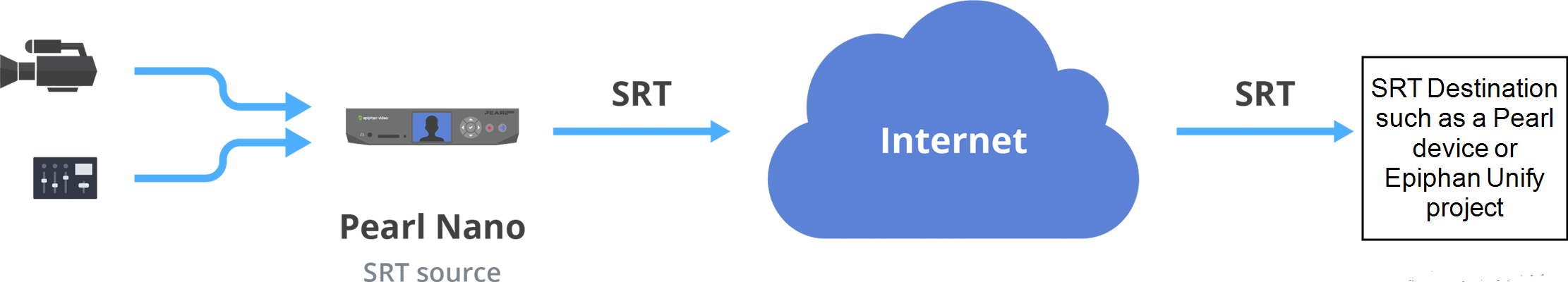 When setting up SRT streaming on Pearl-2, you can configure Pearl-2 as an SRT source encoder and send an SRT stream over the Internet to other SRT destinations (decoders) such as a CDN or another Pearl-2.