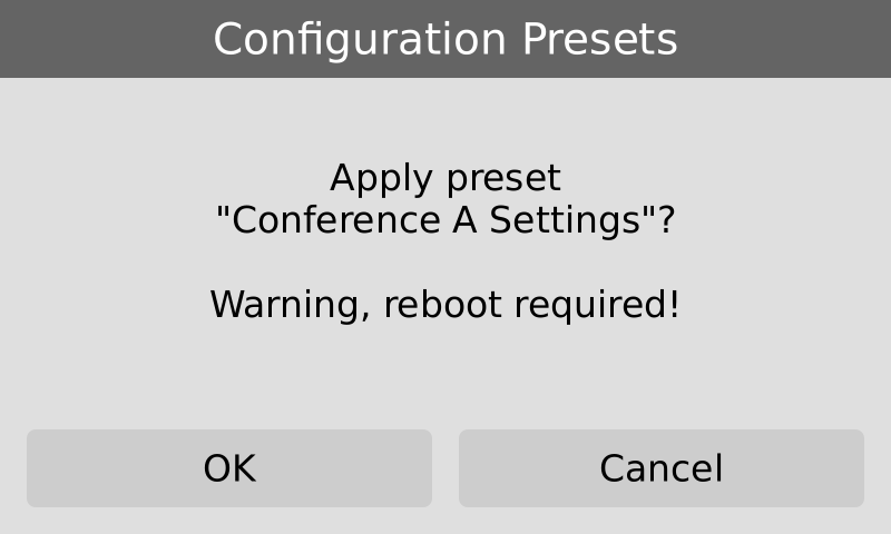 - Click OK when prompted to apply the configuration preset. If the configuration preset includes the network or system configuration groups, a reboot is required.