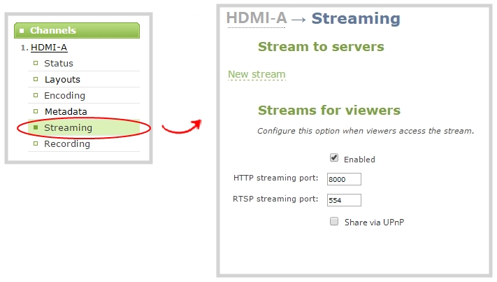 - From the Channels menu, select a channel and click Streaming. The Streaming page opens.