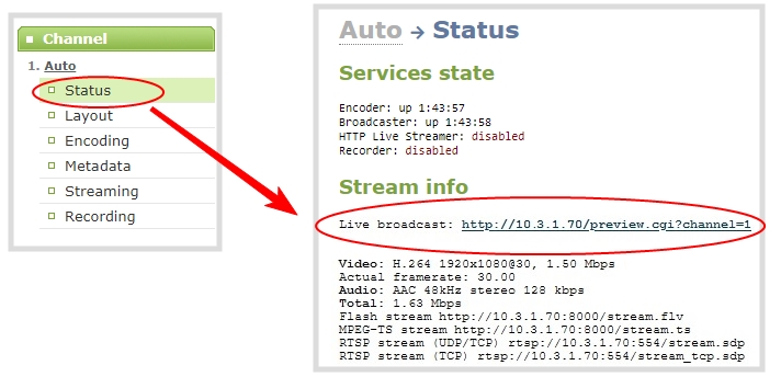 2. From the Channel(s) menu, select the channel and click Status. The Status page opens and a live preview snapshot appears below the Stream info.