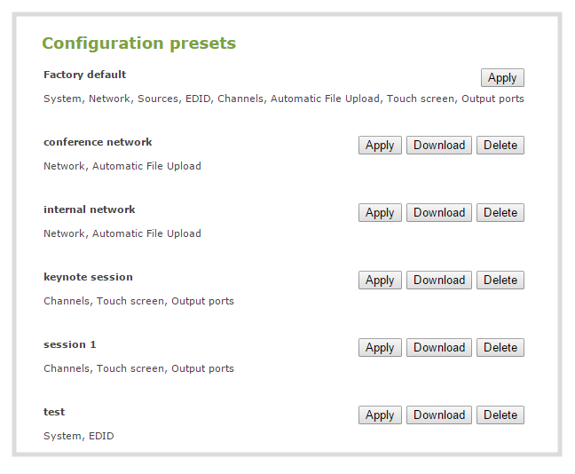 If you need to update a configuration preset to include different configuration groups, or simply new settings for the same groups, you can do so easily via the Admin panel.