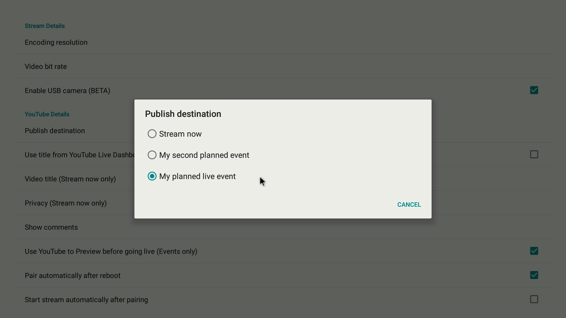 Show me how to create a Live Event on YouTube - If your Webcaster X2 is not already paired with your YouTube (Google) account, you can do that now. See Pair and unpair YouTube. Also ensure that Start stream automatically after pairing is not selected in the Webcaster X2 Preferences; otherwise, you can't manually start your stream whenever you want.